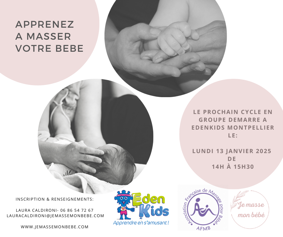 Vous souhaitez apprendre à masser votre tout petit ou vous perfectionner ! Inscrivez-vous au cycle de massage parent-bébé qui démarre le jeudi 2 octobre 2025 de 13h à 14h30 à EdenKids Odysseum à Montpellier. Comment se déroulent les ateliers? Les sessions se composent de 5 ateliers d'1H30 espacés d'une semaine pour vous permettre de découvrir progressivement les mouvements de massage. En tant qu'Instructrice, je vous enseignerai les différents mouvements de massage sur un poupon et vous seul masserez votre bébé. Le programme de massage que je vous propose est destiné aux bébés de 0 à 12 mois. Il inclut des éléments de massage suédois et indiens, de réflexologie plantaire et de Yoga. Les groupes sont restreints (maximum 5 familles) pour permettre une attention personnalisée à chaque famille présente. Les deux parents sont bienvenus. Tarif: 30€ la séance soit 150€ les 5 séances d'1H30 en groupe . Si vous souhaitez partager de beaux moments de complicité avec votre enfant et échanger autour de la parentalité dans une ambiance chaleureuse et conviviale, n'hésitez pas à vous inscrire soit par mail à lauracaldironi@jemassemonbebe.com soit par téléphone au 06.86.54.72.67 soit directement en ligne en remplissant le formulaire disponible ici .