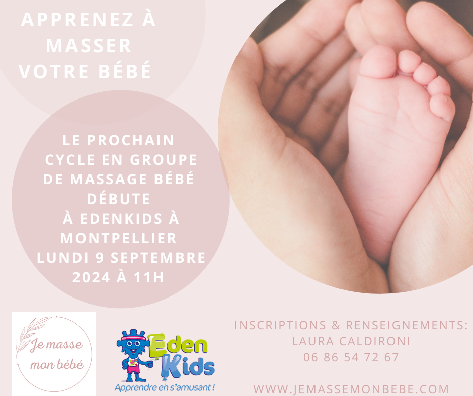 Vous souhaitez apprendre à masser votre tout petit ou vous perfectionner ! Inscrivez-vous au cycle de massage parent-bébé qui démarre le jeudi 2 octobre 2025 de 13h à 14h30 à EdenKids Odysseum à Montpellier. Comment se déroulent les ateliers? Les sessions se composent de 5 ateliers d'1H30 espacés d'une semaine pour vous permettre de découvrir progressivement les mouvements de massage. En tant qu'Instructrice, je vous enseignerai les différents mouvements de massage sur un poupon et vous seul masserez votre bébé. Le programme de massage que je vous propose est destiné aux bébés de 0 à 12 mois. Il inclut des éléments de massage suédois et indiens, de réflexologie plantaire et de Yoga. Les groupes sont restreints (maximum 5 familles) pour permettre une attention personnalisée à chaque famille présente. Les deux parents sont bienvenus. Tarif: 30€ la séance soit 150€ les 5 séances d'1H30 en groupe . Si vous souhaitez partager de beaux moments de complicité avec votre enfant et échanger autour de la parentalité dans une ambiance chaleureuse et conviviale, n'hésitez pas à vous inscrire soit par mail à lauracaldironi@jemassemonbebe.com soit par téléphone au 06.86.54.72.67 soit directement en ligne en remplissant le formulaire disponible ici .