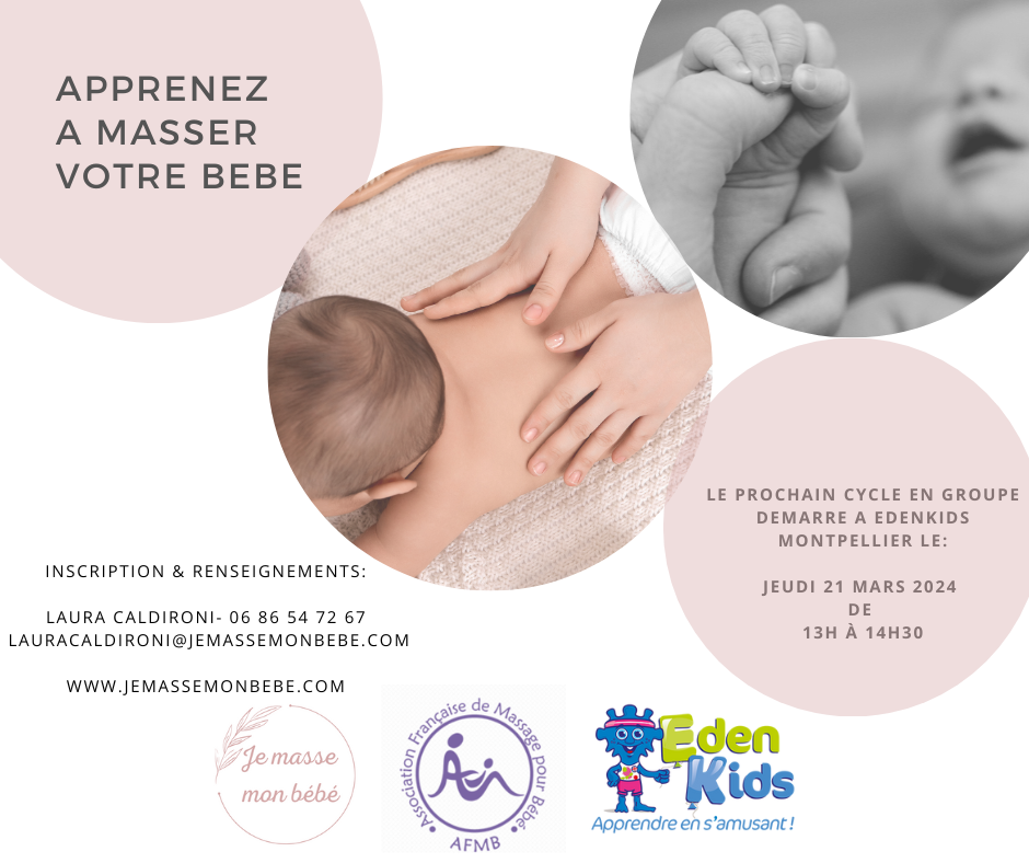 Vous souhaitez apprendre à masser votre tout petit ou vous perfectionner ! Inscrivez-vous au cycle de massage parent-bébé qui démarre le jeudi 2 octobre 2025 de 13h à 14h30 à EdenKids Odysseum à Montpellier. Comment se déroulent les ateliers? Les sessions se composent de 5 ateliers d'1H30 espacés d'une semaine pour vous permettre de découvrir progressivement les mouvements de massage. En tant qu'Instructrice, je vous enseignerai les différents mouvements de massage sur un poupon et vous seul masserez votre bébé. Le programme de massage que je vous propose est destiné aux bébés de 0 à 12 mois. Il inclut des éléments de massage suédois et indiens, de réflexologie plantaire et de Yoga. Les groupes sont restreints (maximum 5 familles) pour permettre une attention personnalisée à chaque famille présente. Les deux parents sont bienvenus. Tarif: 30€ la séance soit 150€ les 5 séances d'1H30 en groupe . Si vous souhaitez partager de beaux moments de complicité avec votre enfant et échanger autour de la parentalité dans une ambiance chaleureuse et conviviale, n'hésitez pas à vous inscrire soit par mail à lauracaldironi@jemassemonbebe.com soit par téléphone au 06.86.54.72.67 soit directement en ligne en remplissant le formulaire disponible ici .