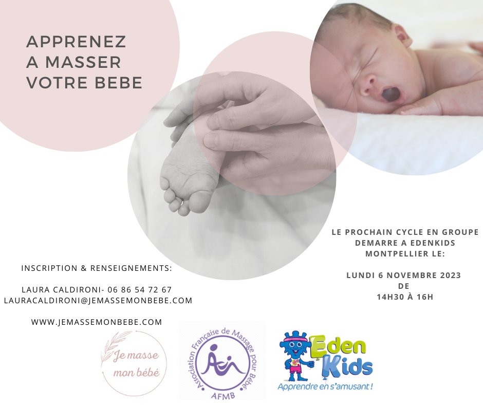 Vous souhaitez apprendre à masser votre tout petit ou vous perfectionner ! Inscrivez-vous au cycle de massage parent-bébé qui démarre le jeudi 2 octobre 2025 de 13h à 14h30 à EdenKids Odysseum à Montpellier. Comment se déroulent les ateliers? Les sessions se composent de 5 ateliers d'1H30 espacés d'une semaine pour vous permettre de découvrir progressivement les mouvements de massage. En tant qu'Instructrice, je vous enseignerai les différents mouvements de massage sur un poupon et vous seul masserez votre bébé. Le programme de massage que je vous propose est destiné aux bébés de 0 à 12 mois. Il inclut des éléments de massage suédois et indiens, de réflexologie plantaire et de Yoga. Les groupes sont restreints (maximum 5 familles) pour permettre une attention personnalisée à chaque famille présente. Les deux parents sont bienvenus. Tarif: 30€ la séance soit 150€ les 5 séances d'1H30 en groupe . Si vous souhaitez partager de beaux moments de complicité avec votre enfant et échanger autour de la parentalité dans une ambiance chaleureuse et conviviale, n'hésitez pas à vous inscrire soit par mail à lauracaldironi@jemassemonbebe.com soit par téléphone au 06.86.54.72.67 soit directement en ligne en remplissant le formulaire disponible ici .