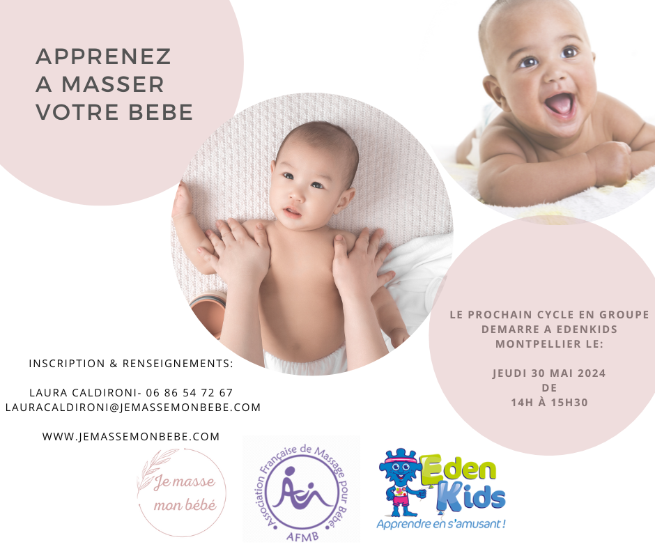 Vous souhaitez apprendre à masser votre tout petit ou vous perfectionner ! Inscrivez-vous au cycle de massage parent-bébé qui démarre le jeudi 2 octobre 2025 de 13h à 14h30 à EdenKids Odysseum à Montpellier. Comment se déroulent les ateliers? Les sessions se composent de 5 ateliers d'1H30 espacés d'une semaine pour vous permettre de découvrir progressivement les mouvements de massage. En tant qu'Instructrice, je vous enseignerai les différents mouvements de massage sur un poupon et vous seul masserez votre bébé. Le programme de massage que je vous propose est destiné aux bébés de 0 à 12 mois. Il inclut des éléments de massage suédois et indiens, de réflexologie plantaire et de Yoga. Les groupes sont restreints (maximum 5 familles) pour permettre une attention personnalisée à chaque famille présente. Les deux parents sont bienvenus. Tarif: 30€ la séance soit 150€ les 5 séances d'1H30 en groupe . Si vous souhaitez partager de beaux moments de complicité avec votre enfant et échanger autour de la parentalité dans une ambiance chaleureuse et conviviale, n'hésitez pas à vous inscrire soit par mail à lauracaldironi@jemassemonbebe.com soit par téléphone au 06.86.54.72.67 soit directement en ligne en remplissant le formulaire disponible ici .